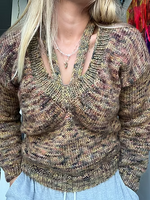 The sweater is knitted from the top down. Starting from the shoulders and from there worked back and forth. The two sides are connected under the armpits and from there work as one piece while you increase the neckline. The sweater is joined in round after the increase and knitted in round from there. Stitches for the sleeves are picked up from each side and knitted in round with decrease. Stitches for the neckline are picked up from the neckline and knitted in round. The straps in the neckline are knitted back and forth and stitched down on the backside of the neckline.