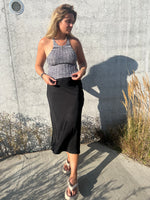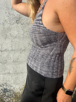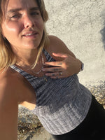 The top is worked bottom-up in the round, using 3 × 3 rib throughout. Shaping is done with decreases and increases. Once the body is complete, work is divided into front and back. Each side is worked with rib then joined at the shoulders using mattress stitch.