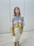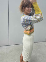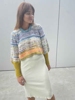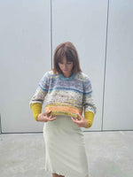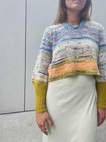 Is one of a kind hand knitted sweater, made out of 100% hand dyed baby alpaca wool along with 100% highland wool. Super soft style knitted out of scrappy yarns that have been collected over a long period of time in order to eliminate all waste in the studio.