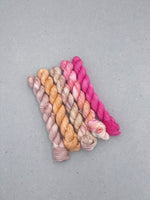 These minis are incredibly soft and airy, and feel comfortable directly against the skin. They’re perfect for socks, shawls, baby knits, and also lovely held together with a silk mohair as a companion thread for lightweight sweaters.