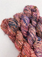 A true artisan yarn with rich texture and vibrant personality, our Recycled Silk Sari Yarn is a joy to work with. It adds a bold, one of a kind look to your projects full of character and color.