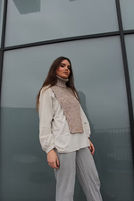 The neckwarmer is knitted from the bottom to the top as two seperate pieces, front and back, and connected together by the shoulders. The turtle neck is knitted in round after the body part has been connected.