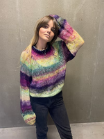 Change the threads accordingly : Every 3rd - 5th row ; remove 1 color and add in another color instead. Just make sure you are always working with 4 strands of mohair/Angel lace at the same time. When you run out of mohair, you can simply felt the threads together. Leave around 10 cm of your end to rub against the new thread, slowly your yarns will start sticking to one another and you will have little or even no threads to weave in when you’re finished with the sweater. Just tie knots with the Angel lace. Push yourself in mixing colors with high contrast or even colors your would normally not put together. See how the colors rub off to one another and how the shades can change. You are your own designer here, as you are not only knitting you are also sculpting your own textile and hopefully emptying out your knitting stash.